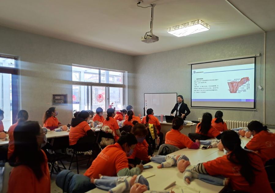 讲师苏老师一边讲解,一边示范标准动作,学员们聚精会神,领会吸收母婴护理工作的要点。