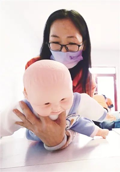 学员们一边背诵着讲师编写的按摩顺口溜儿,一边用婴儿模型进行按摩训练。