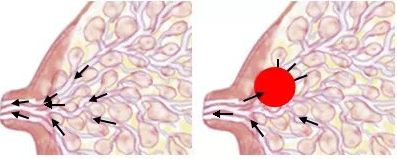 乳汁流经十几根细细的乳腺导管,汇聚至乳晕。宝宝吃奶就是通过挤压乳晕吃到奶水的。当大量的乳汁淤积在乳腺导管的某个分岔处(如上图红色位置),长时间不能顺利排出时,局部乳腺管就会被乳汁撑得硬邦邦的,而与此同时周边组织也会因压力而产生水肿,这两个因素构成了“硬块”。
