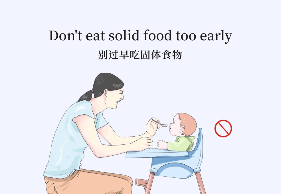 除配方奶粉外,过早给孩子添加固体食物也会提高肥胖的几率。因为宝宝睡觉多,而固体食物不容易消化,一旦睡着了,这些固体食物很容易转化成脂肪。所以过早添加固体食物,是一个很不明智的饮食习惯。如果你的宝宝有发胖的趋势,可以晚一点添加固体食 物,而且在添加固体食物时,可以选择营养丰富热量低的食物,比如选择蔬菜而不是水果,选择全谷物而不是精加工的。