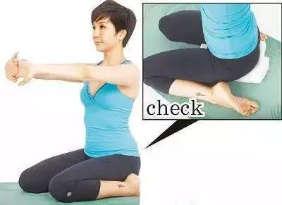 1、跪坐,大腿往内转,使小腿在大腿外侧贴地,臀部鼠蹊部下垫厚毛巾让臀部坐稳地面,吐气,双手交握,掌心往正前方延伸,手肘伸直,注意双手约与肩同高,背部仍往头顶延伸。