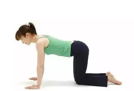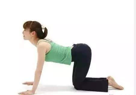 2、吐气,背部弓起,腹部收紧向上,头部下垂,静止5秒。